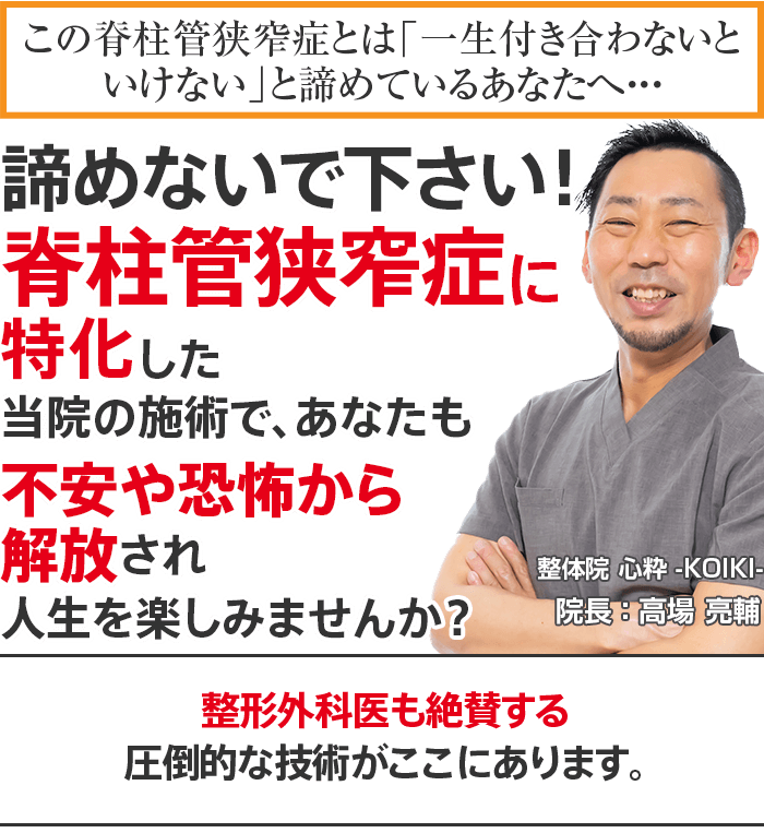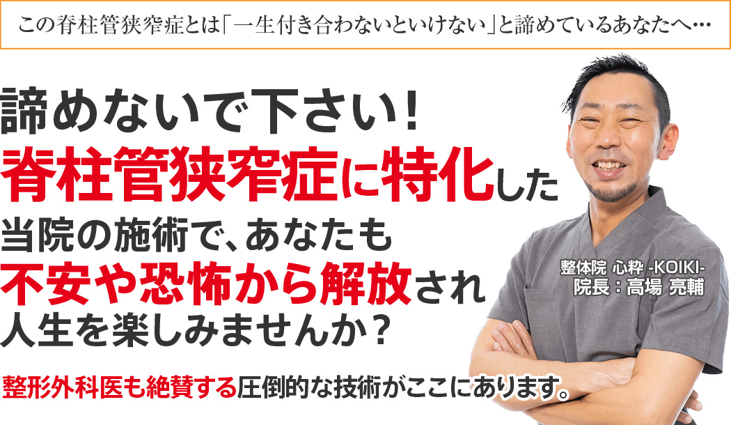 身体の専門家として国家資格を所持し、高い技術で辛い脊柱管狭窄症をお持ちの多数の方々から支持され、あなたの悩みに真正面から向き合ってくれる大阪市淀川区で唯一の脊柱管狭窄症専門整体院 心粋 -KOIKI-に来院し、脊柱管狭窄症による不安や恐怖から解放された人生を手に入れる道。